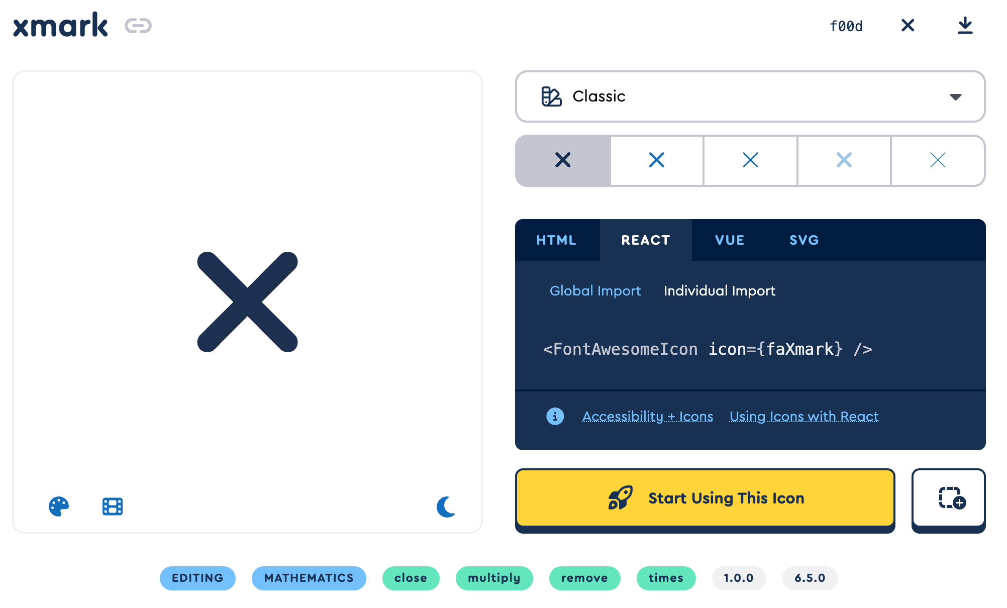 import { FontAwesomeIcon } from '@fortawesome/react-fontawesome'; // 여러 아이콘을 사용하고 싶다면 ,로 구분해서 추가해주기 import { faXmark, faPenToSquare } from '@fortawesome/free-solid-svg-icons';사용하고 싶은 아이콘의 이름은 FontAwesome 사이트에서 검색 → React 탭의 Individual import에서 확인이 가능하다. (기본 이름을 확인하고 에디터에서 미리보기를 활용하여 import 하는 것도 가능하다.)