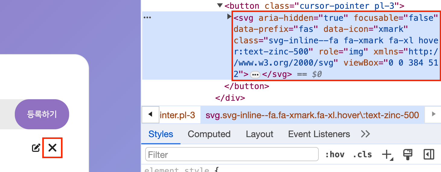import { FontAwesomeIcon } from '@fortawesome/react-fontawesome'; // 여러 아이콘을 사용하고 싶다면 ,로 구분해서 추가해주기 import { faXmark, faPenToSquare } from '@fortawesome/free-solid-svg-icons';사용하고 싶은 아이콘의 이름은 FontAwesome 사이트에서 검색 → React 탭의 Individual import에서 확인이 가능하다. (기본 이름을 확인하고 에디터에서 미리보기를 활용하여 import 하는 것도 가능하다.)
