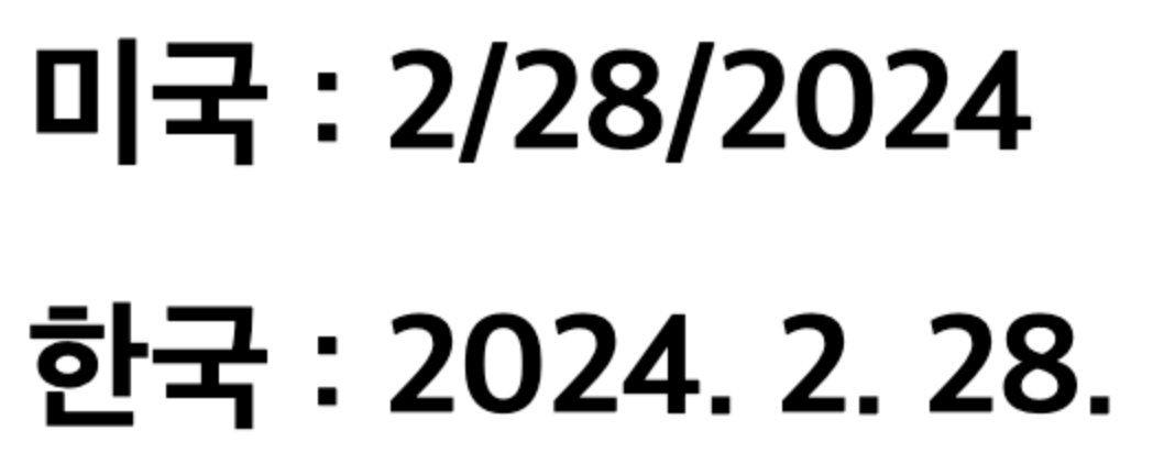 받아온 Date 객체를 원하는 국가의 BCP 47 언어 태그를 매개변수로 전달해주면, 그 국가에 해당되는 포맷의 날짜가 반환된다.