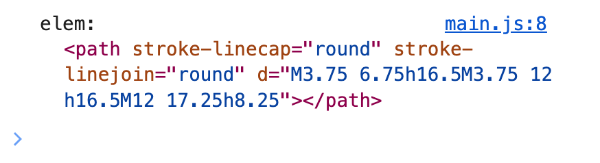 event 객체의 target 속성을 통해 클릭한 요소의 정보를 알아낼 수 있다. 이때 우리가 필요한 것은 클릭한 메뉴 '버튼'인데 현재 button 요소 안에 svg -> path 요소에 대한 정보를 받아오는 것을 확인할 수 있다.