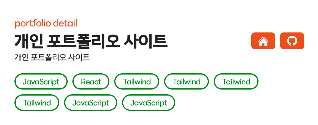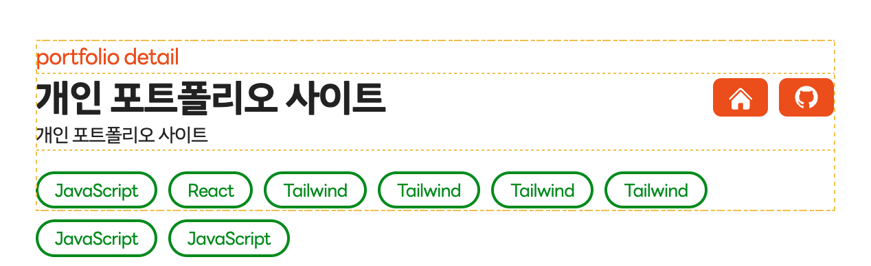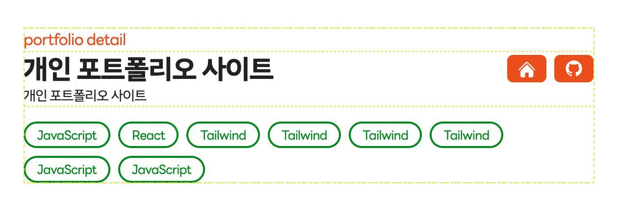 <section> <div> <!-- 전체 여백을 위한 div --> <article> <span>portfolio detail</span> <div> <!-- 프로젝트 제목/설명 + 버튼 레이아웃을 위한 div --> <h2>개인 포트폴리오 사이트</h2> <p>포트폴리오 설명</p> </div> <div> <!-- 링크 버튼 wrapper div --> <a>배포 사이트</a> <a>깃허브</a> </div> </div> <ul> <li>스택</li> <li>스택</li> </ul> </article> </div> </section>