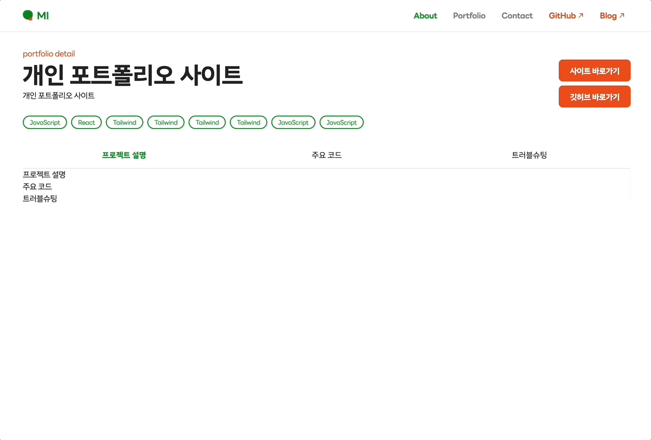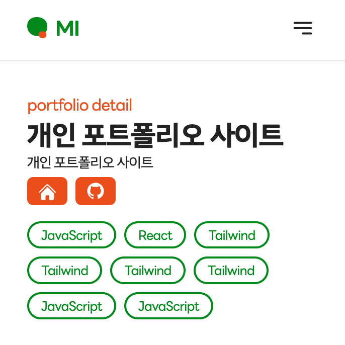 반응형 적용 화면 또한, 작업한 시안에서는 사이트 바로가기와 깃허브 바로가기 버튼이 단어와 아이콘 조합으로 되어있는데, detail 페이지에서는 화면을 좀 더 넓게 쓸 수 있으니 버튼명을 정확히 명시해 줘도 좋겠다는 생각이 들어 변경해 주었다.