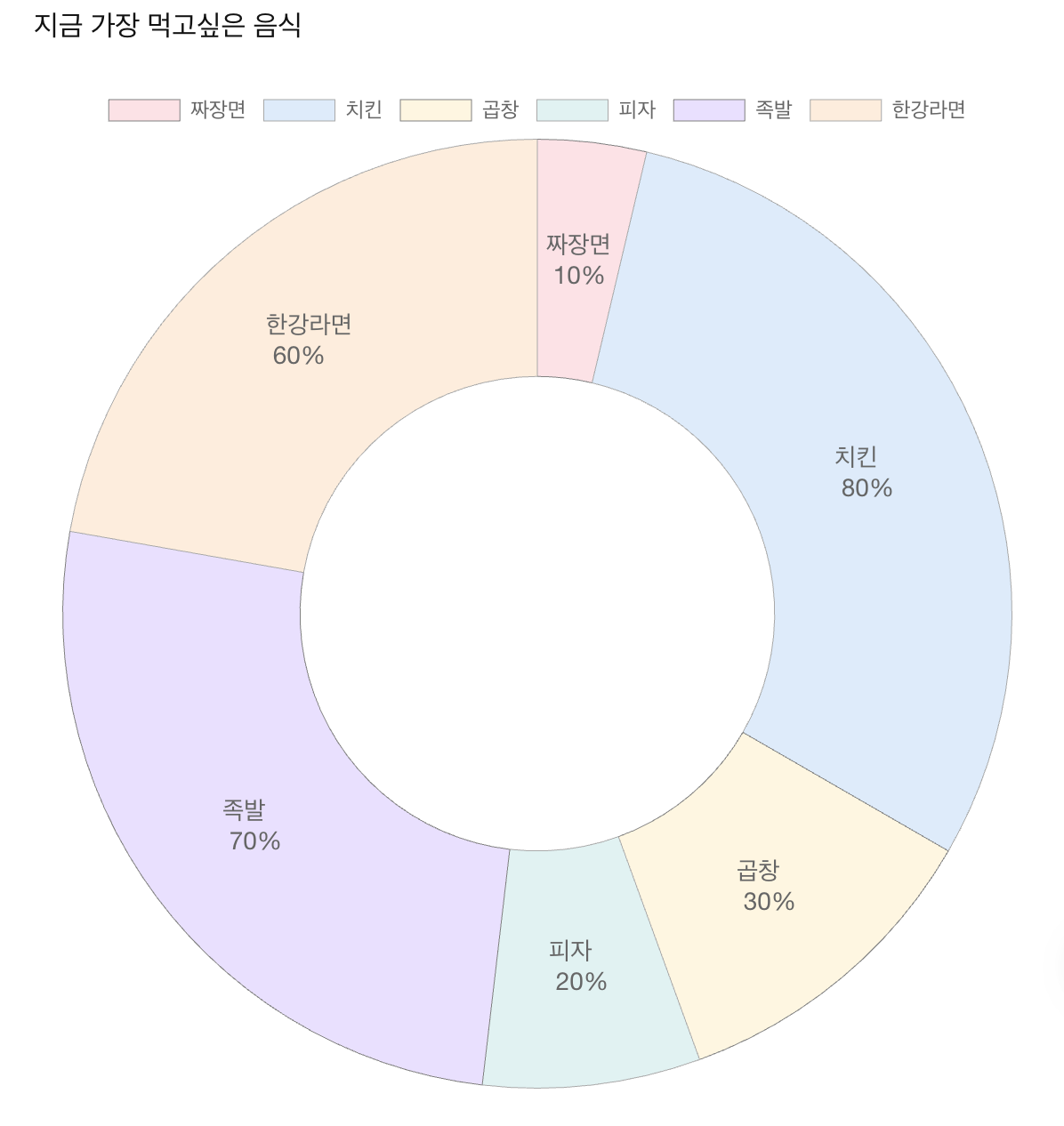 import { Chart as ChartJS, ArcElement, Tooltip } from "chart.js"; import { Doughnut } from "react-chartjs-2"; ChartJS.register(ArcElement, Tooltip); // 차트에 사용될 각 항목 라벨명 const labels = ["짜장면", "치킨", "곱창", "피자", "족발", "한강라면"]; export const data = { labels, datasets: [ { // 툴팁에 표시 될 라벨 label: "지금 가장 먹고 싶은 음식", // 각 항목에 대한 데이터 data: [10, 80, 30, 20, 70, 60], // 각 항목별 컬러 backgroundColor: [ "rgba(255, 99, 132, 0.2)", "rgba(54, 162, 235, 0.2)", "rgba(255, 206, 86, 0.2)", "rgba(75, 192, 192, 0.2)", "rgba(153, 102, 255, 0.2)", "rgba(255, 159, 64, 0.2)", ], // 테두리 컬러 borderColor: ["gray", "darkgray"], borderWidth: 0.5, }, ], }; // 컴포넌트를 정의하고, react-chartjs-2 차트에서 가져온 Doughnut 컴포넌트에 data 전달 export const DoughnutChart = () => { return <Doughnut data={data} />; };이렇게 지정을 해주면 아래와 같은 형태의 차트가 그려진다.