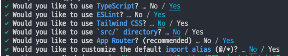 ✔ Would you like to use TypeScript? … Yes # 타입스크립트 사용 여부 ✔ Would you like to use ESLint? … Yes # ESLint 사용 여부 ✔ Would you like to use Tailwind CSS? … No # Tailwind CSS 사용 여부 ✔ Would you like to use `src/` directory? … No # src/ 디렉토리 사용 여부 ✔ Would you like to use App Router? (recommended) … Yes # App Router 사용 여부 ✔ Would you like to customize the default import alias (@/*)? … No # `@/*` 가 아닌 다른 별칭 사용 여부1-3) Prettier 설치