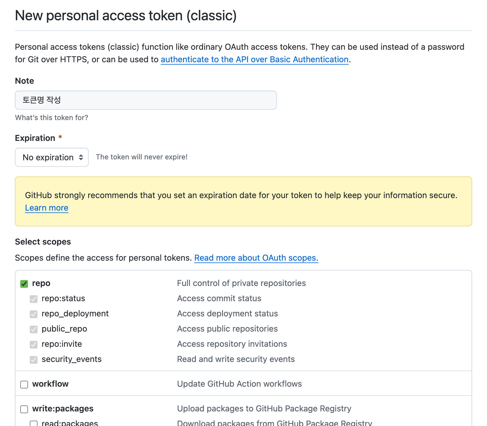 3. 왼쪽 사이드바에 있는 Personal access tokens 토글 메뉴에서 원하는 생성 방식 클릭나는 토큰 생성 버전을 classic으로 발급받았는데, 이유는 새로운 생성 버전은 날짜로만 기한을 정할 수 있길래 그냥 옵션 자체로 기한을 무제한으로 설정할 수 있는 classic 버전을 선택했다. 무제한 설정 방법은 Expiration의 옵션을 No expiration으로 설정해 주면 된다.