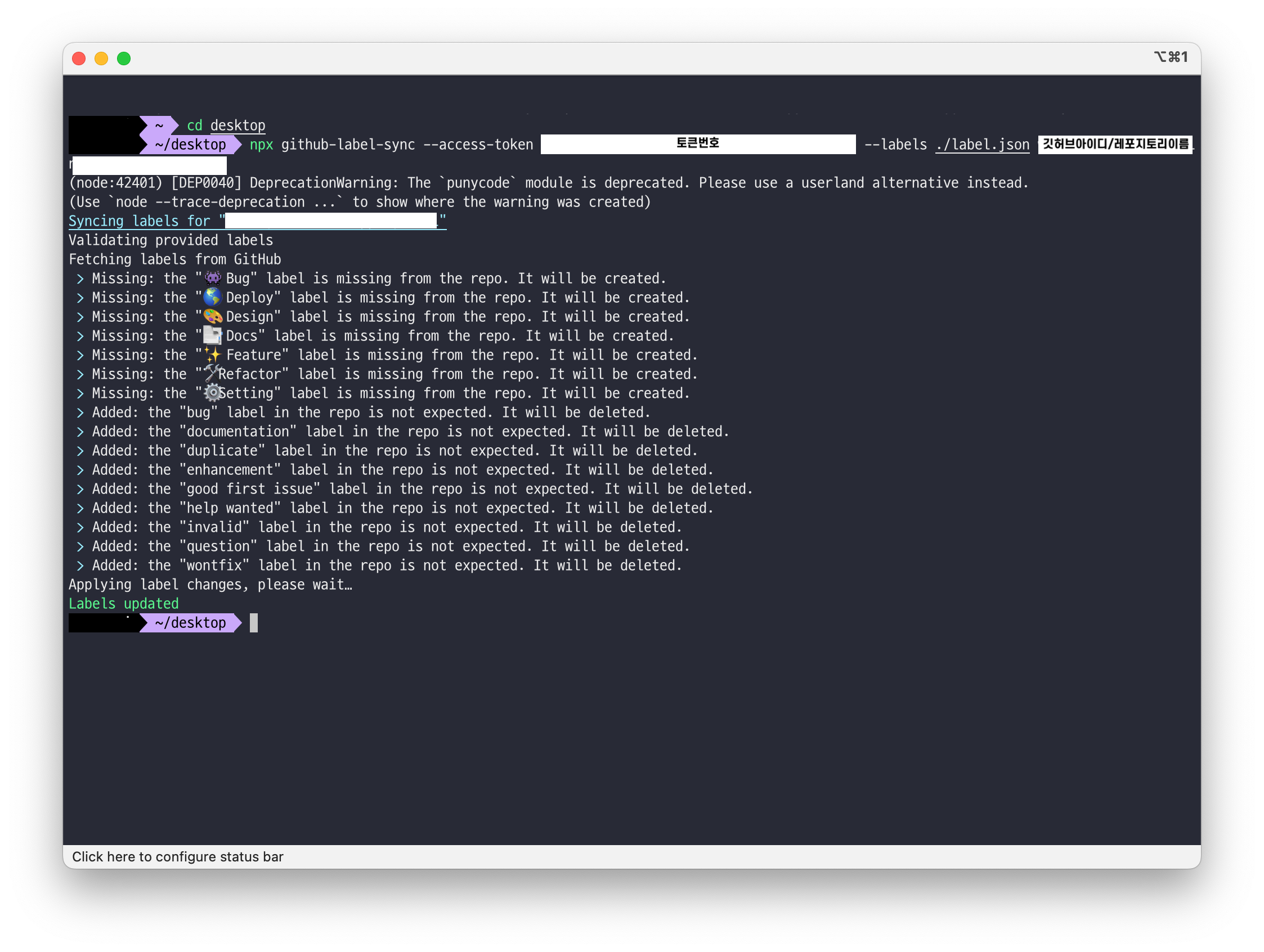 npx github-label-sync --access-token [액세스토큰] --labels ./labels.json [계정아이디]/[레포명]- 개인 개정의 레포지토리에 연결할 거라면 본인 깃허브 아이디(username으로 지정해 둔 이름)/저장소이름을 넣으면 되고 organization이라면 팀명/저장소이름을 적어준다.