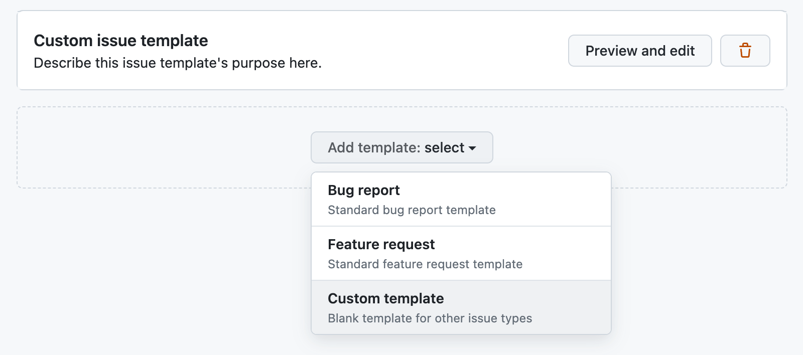 Issue 템플릿 양식은 총 3개가 주어지는데, 나는 팀에서 정한 양식을 사용하기 위해 Custom 옵션을 선택했다.