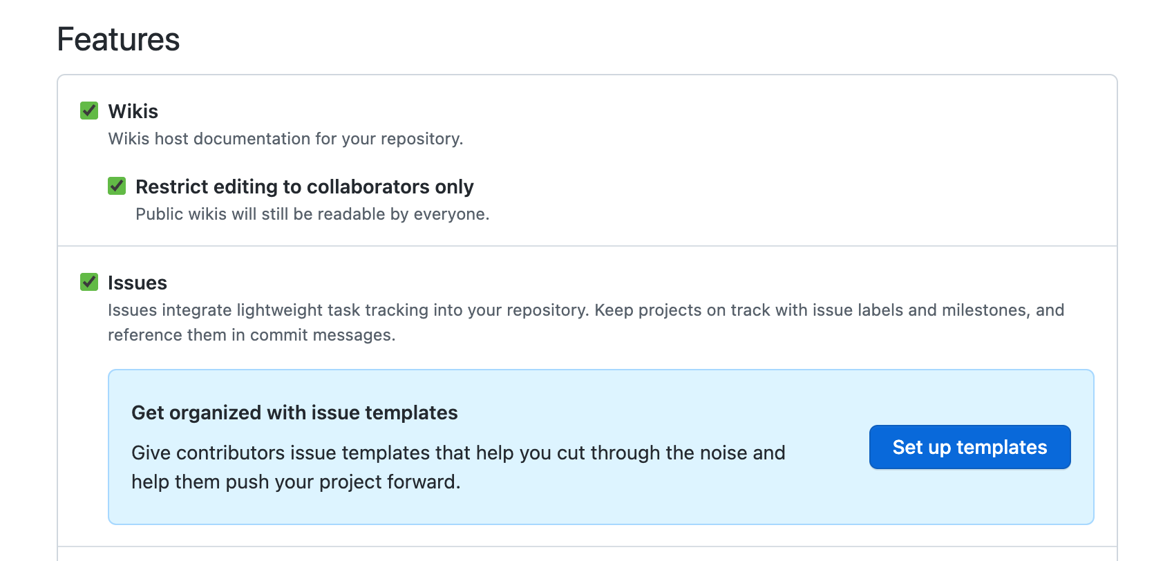 2) 좌측 사이드바의 General 메뉴의 페이지에서 Features에 있는 Issues 옵션으로 이동 > Set up templates 버튼을 클릭한다.