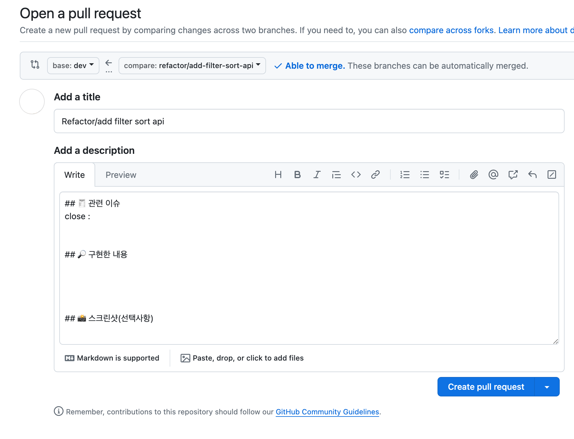 2) 원하는 양식을 넣어주고, 상단의 파일명을 pull_request_template.md로 입력해 준다.