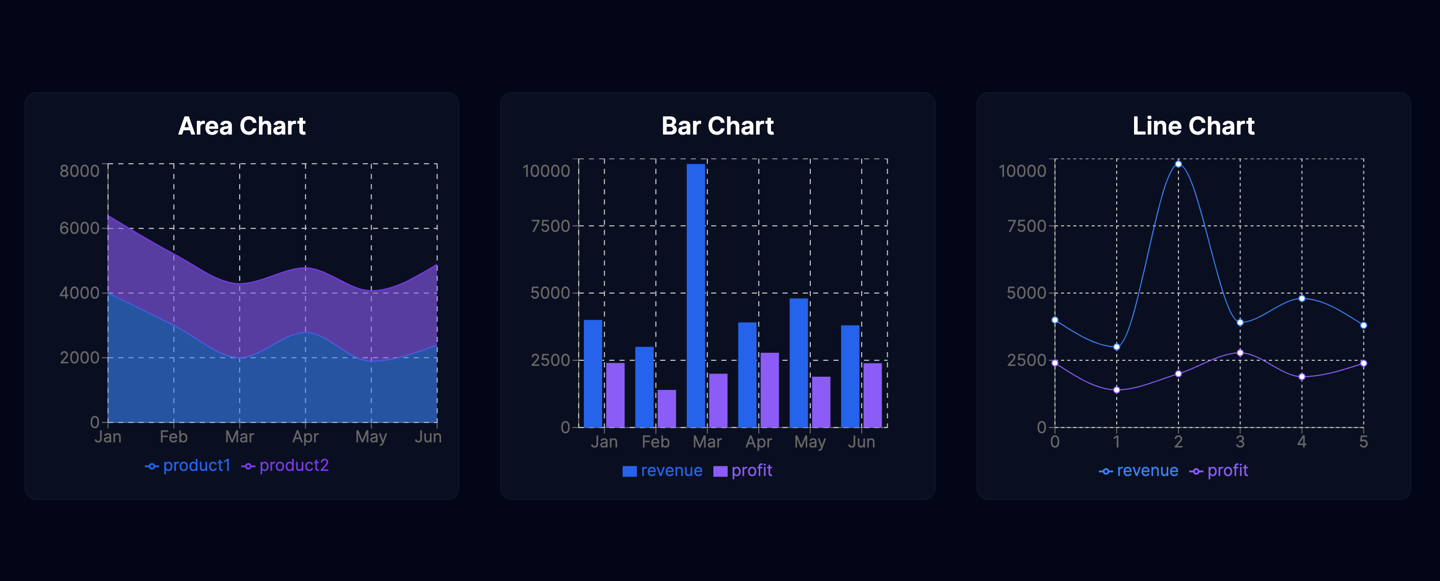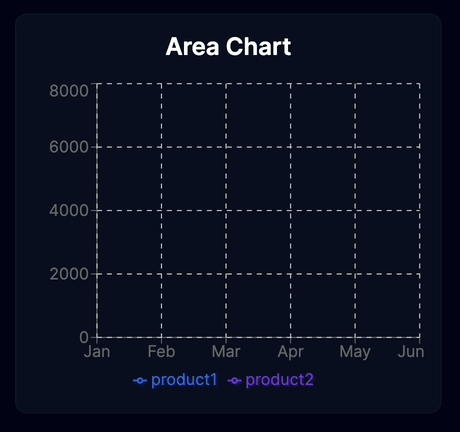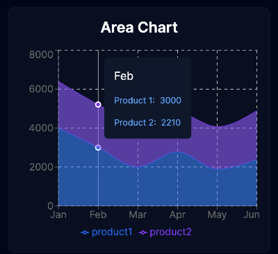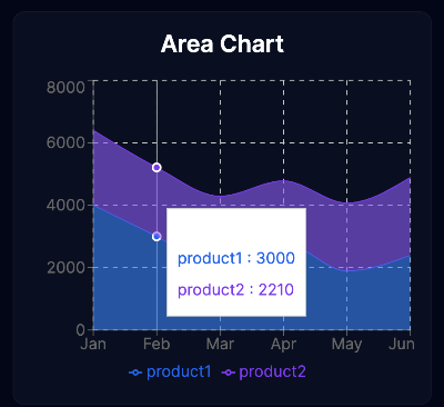 기본 구성은 아래와 같다.const productSales = [{name: 'Jan', product1: 4000, product2: 2400}, ...]; const AreaChartComponent = () => { return ( <ResponsiveContainer> <AreaChart width={400} height={400} data={productSales}> <Area type="monotone" dataKey="product1" stroke="#8884d8" fill="#3b82f6" stackId="1" /> <Area type="monotone" dataKey="product2" stroke="#7c3aed" fill="#8b5cf6" stackId="1" /> </AreaChart> </ResponsiveContainer> ); };- ResponsiveContainer : 차트를 반응형으로 만들어주는 컨테이너