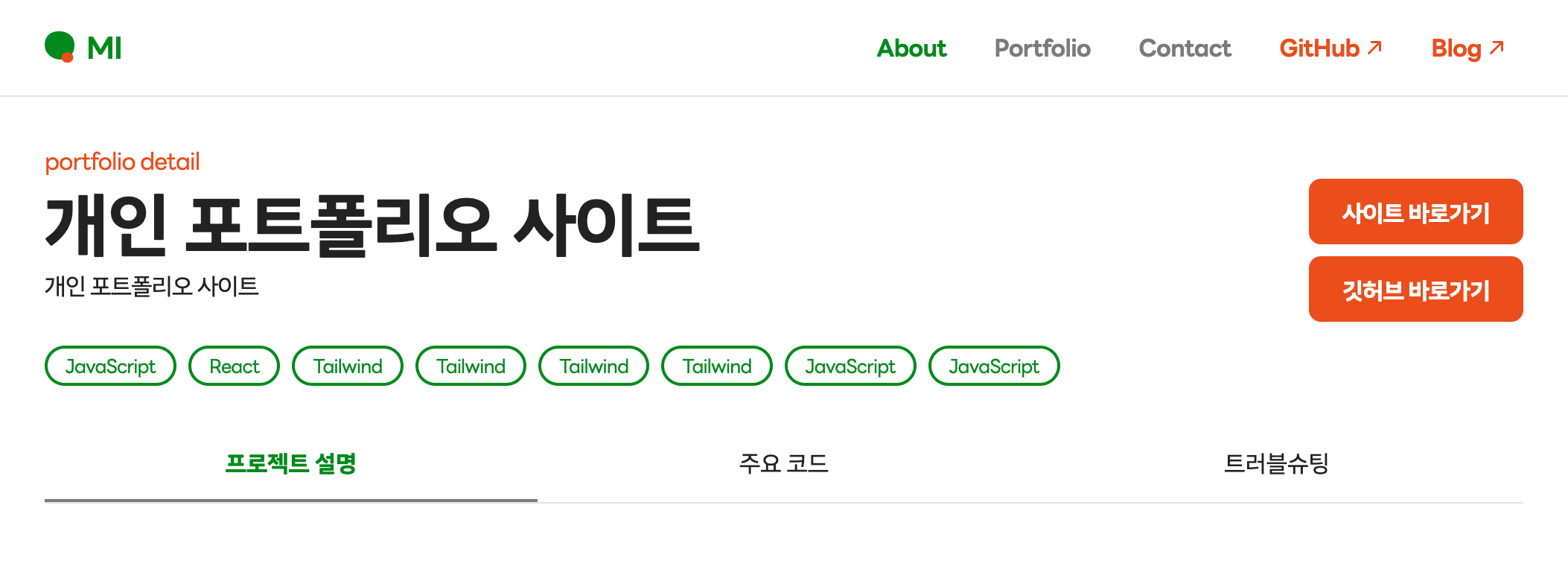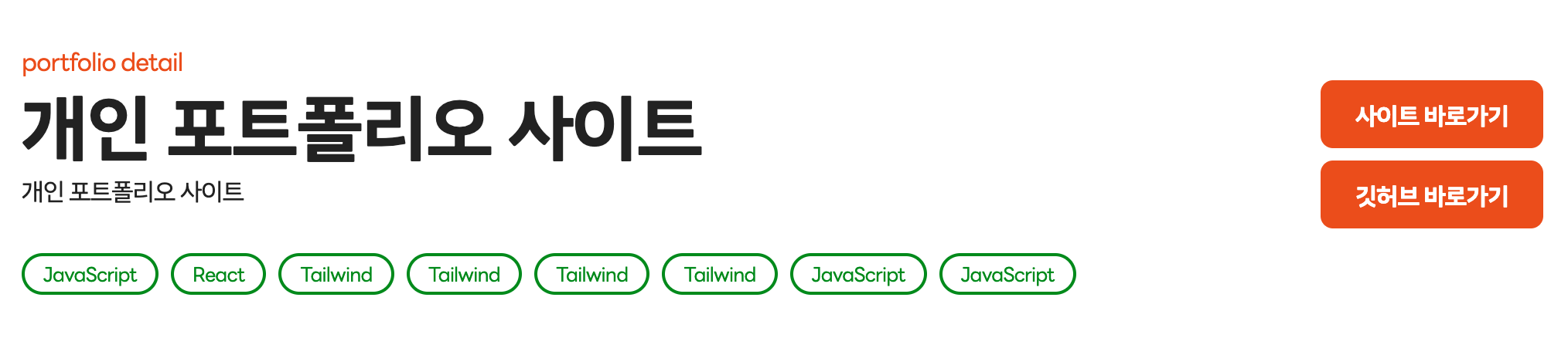 또한, 작업한 시안에서는 사이트 바로가기와 깃허브 바로가기 버튼이 단어와 아이콘 조합으로 되어있는데, detail 페이지에서는 화면을 좀 더 넓게 쓸 수 있으니 버튼명을 정확히 명시해 줘도 좋겠다는 생각이 들어 변경해 주었다.