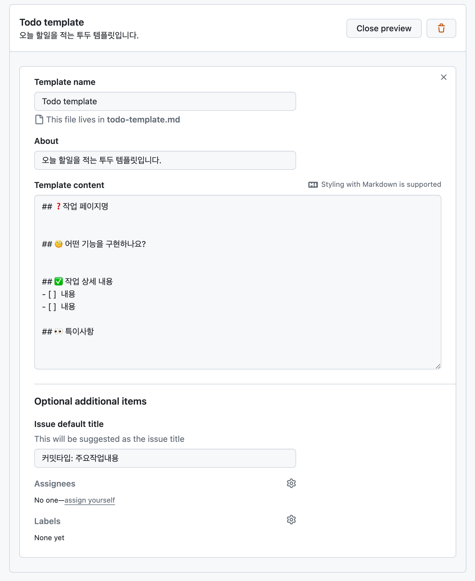 - Issue default title : 템플릿 선택 시 기본으로 들어가는 제목 양식. 빈칸인 경우 공백.
